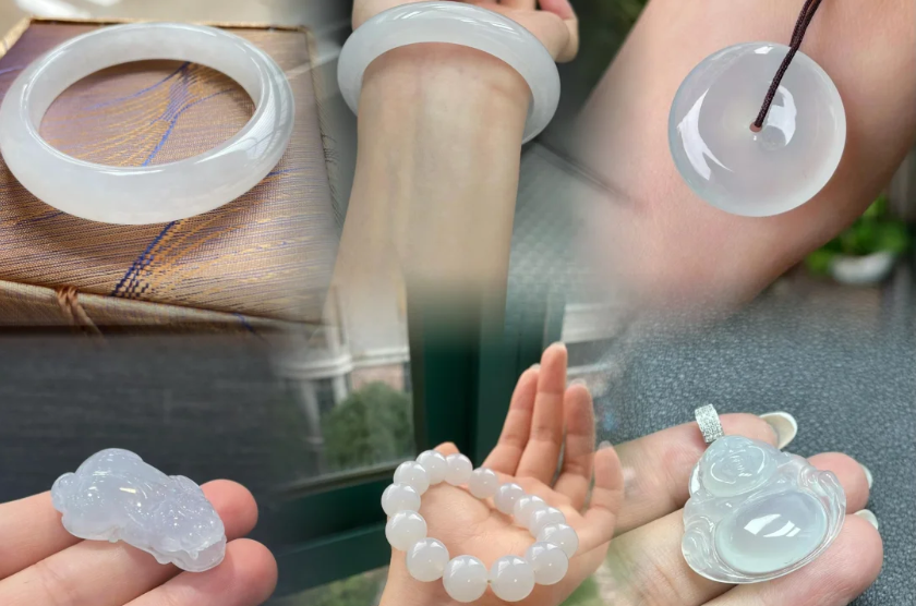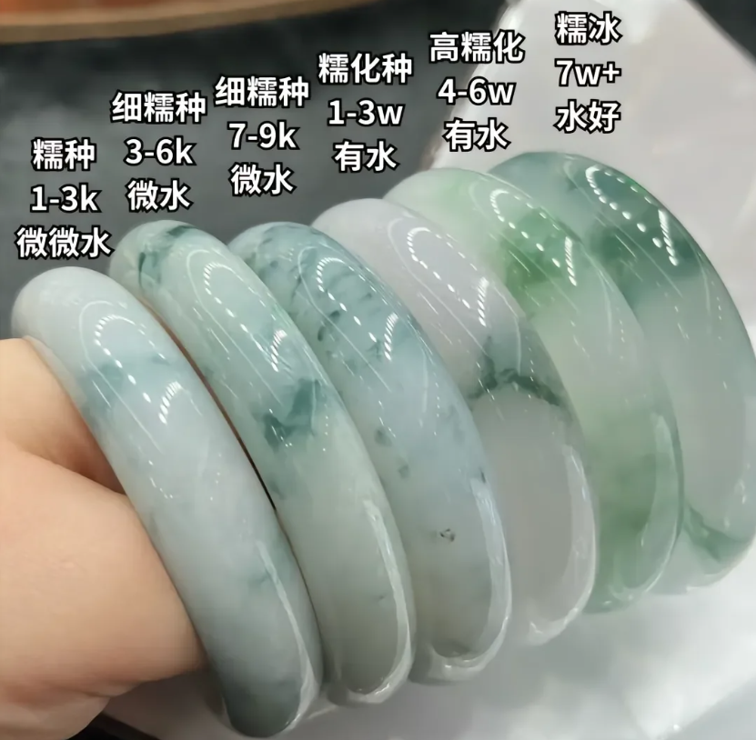“种” 指的是翡翠的质地粗细和透明度,它直接决定了翡翠的质感和光泽。常见的翡翠种水从高到低主要有以下几种: