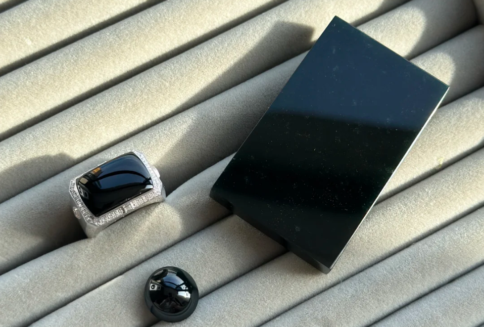 6.黑色翡翠:黑色翡翠也叫 “墨翠”,外观呈黑色,但在透射光下会呈现出浓郁的绿色。墨翠质地细腻,光泽明亮,给人一种神秘高贵的感觉,近年来在市场上越来越受欢迎,优质的墨翠价格也在不断上涨。