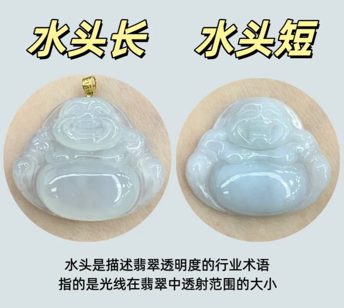“水” 也叫 “水头”,指的是翡翠的透明度和光泽度,它是衡量翡翠品质的重要指标之一。翡翠的水头越好,透明度就越高,光泽也就越莹润,给人一种水灵灵的感觉。 判断翡翠水头的好坏,通常可以通过观察翡翠内部光线的透射情况。将翡翠放在光线充足的地方,若能看到光线深入翡翠内部较多,且边缘有明显的光晕,说明水头较好;反之,若光线只能停留在翡翠表面,无法深入内部,说明水头较差。 水头好的翡翠,不仅外观更加美观,而且在一定程度上也能提升翡翠的价值。例如,同样颜色和种的翡翠,水头好的价格会比水头差的高出不少。